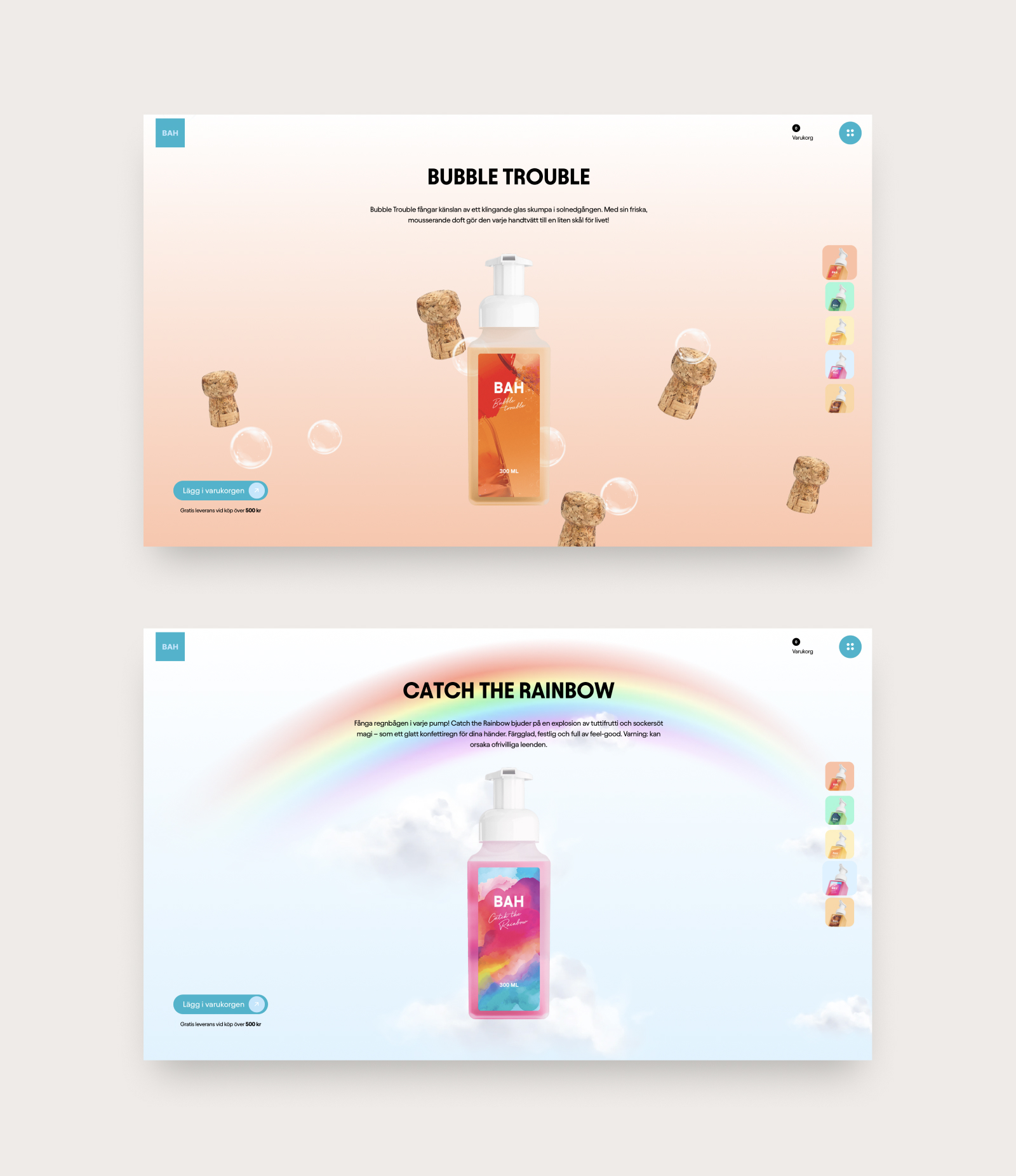BAH Soap behövde en digital upplevelse som inte bara visade produkterna, utan som också förmedlade känslan av lekfull vardagslyx. Utmaningen var att skapa en webbplats som kändes levande och personlig, utan att tumma på enkelhet, tydlighet eller prestanda – samtidigt som lösningen behövde fungera sömlöst med e-handel.